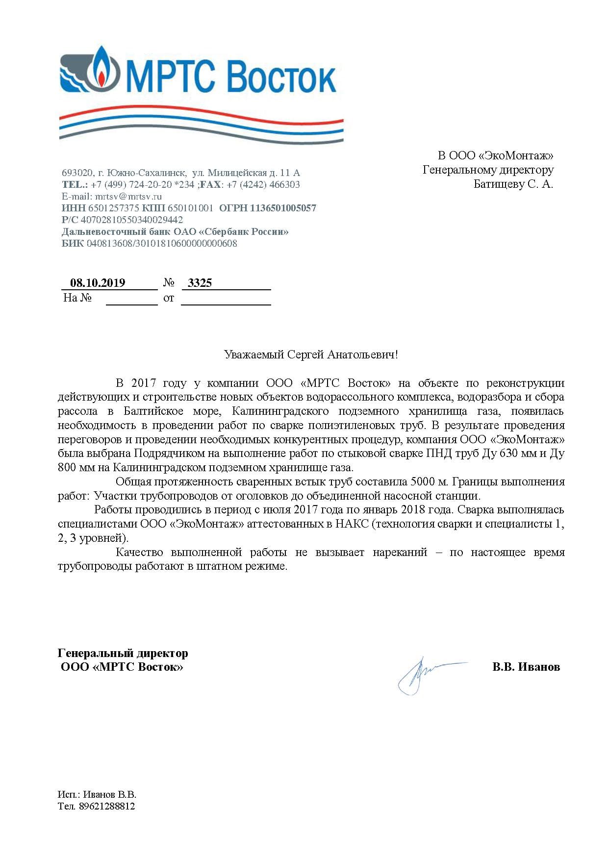 Благодарственное письмо ООО «МРТС Восток»